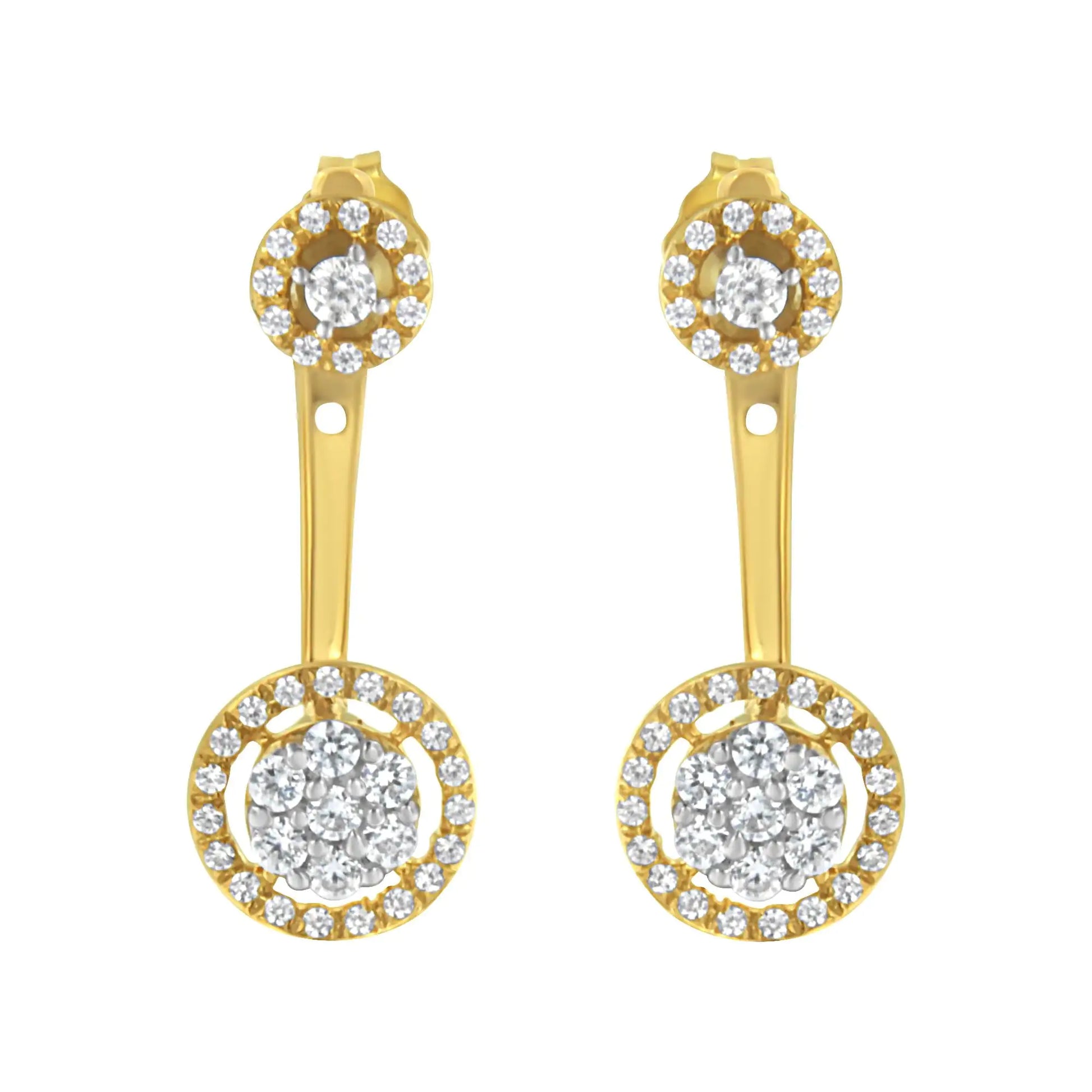 Delight in the timeless elegance of our 14K yellow gold-plated sterling silver earrings. Embellished with a stunning array of round-cut diamonds totaling 5/8 carat, these earrings radiate a captivating sparkle. Versatility is at the heart of this design, featuring detachable studs. Each stud showcases a central round-cut diamond, encased by a halo of accent diamonds. The flower-inspired design of the studs, with a diamond cluster nestled within a floating halo of accents, adds an extra layer of allure. With a graceful drop of 4/5 inch, these pieces add a dash of sophistication to any look. They can be worn with or without the jackets, suiting both casual and formal styles. As a testament to fine craftsmanship and elegance, these earrings are a worthy addition to any collection. For a subtler effect, the top stud can be worn solo.
