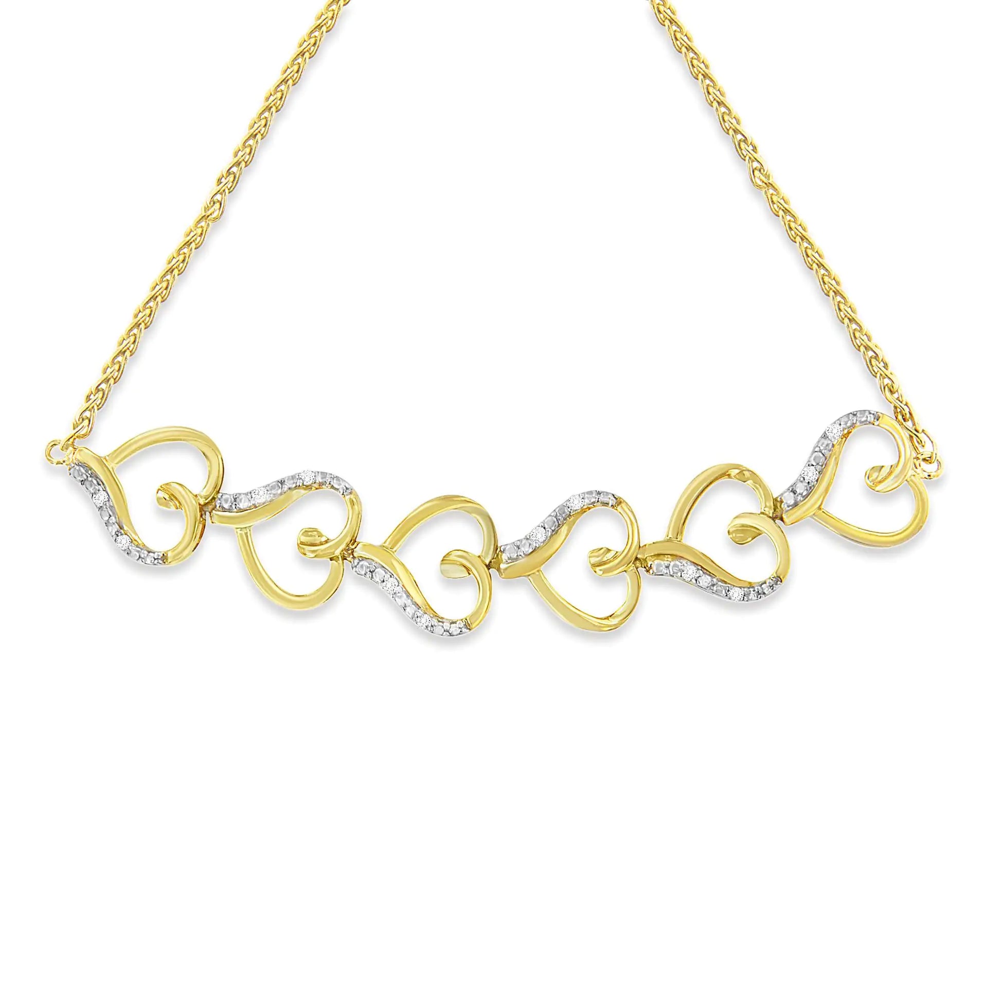 Love is all over this exquisite bracelet. Six heart shapes connect to one another in this 14k yellow gold plated sterling silver bolo bracelet. Each heart is created by a single yellow gold ribbon that twists and flows to create the shape. One side of the heart is accented by silver beading accented with two glimmering round cut diamonds. 1/10ct TDW of diamonds are displayed in this adjustable bolo bracelet design.